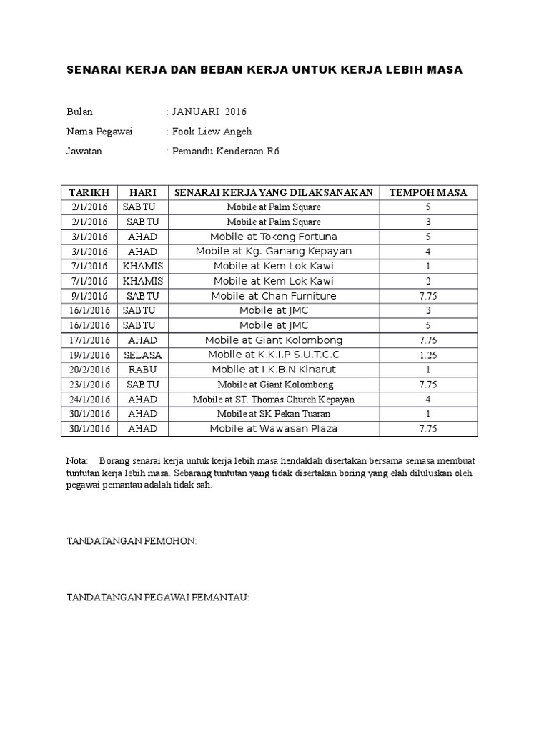 Senarai Kerja Dan Beban Kerja Untuk Kerja Lebih Masa Jan 2016 Pdf